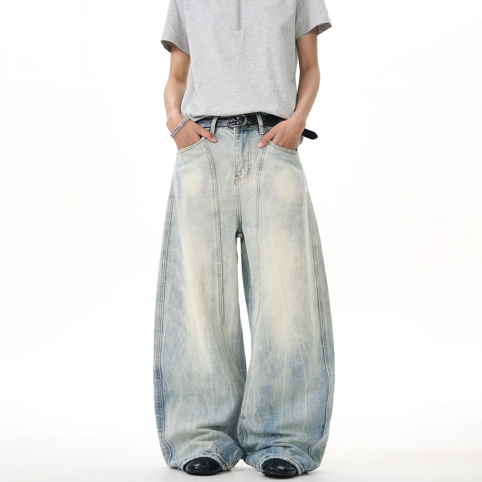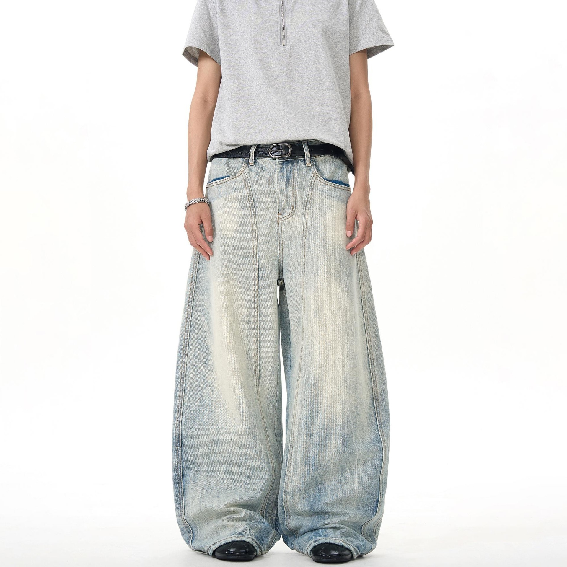 Deconstructed Elements: Unique scimitar-cut and loose wide-leg silhouette for a trendy, street-ready aesthetic.