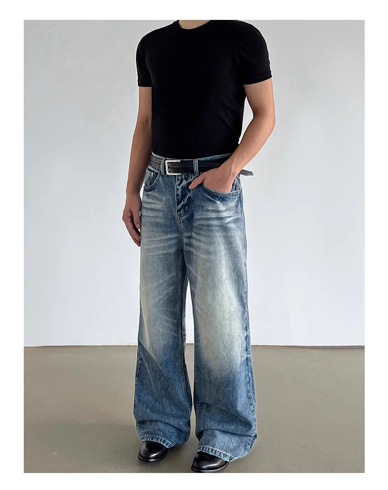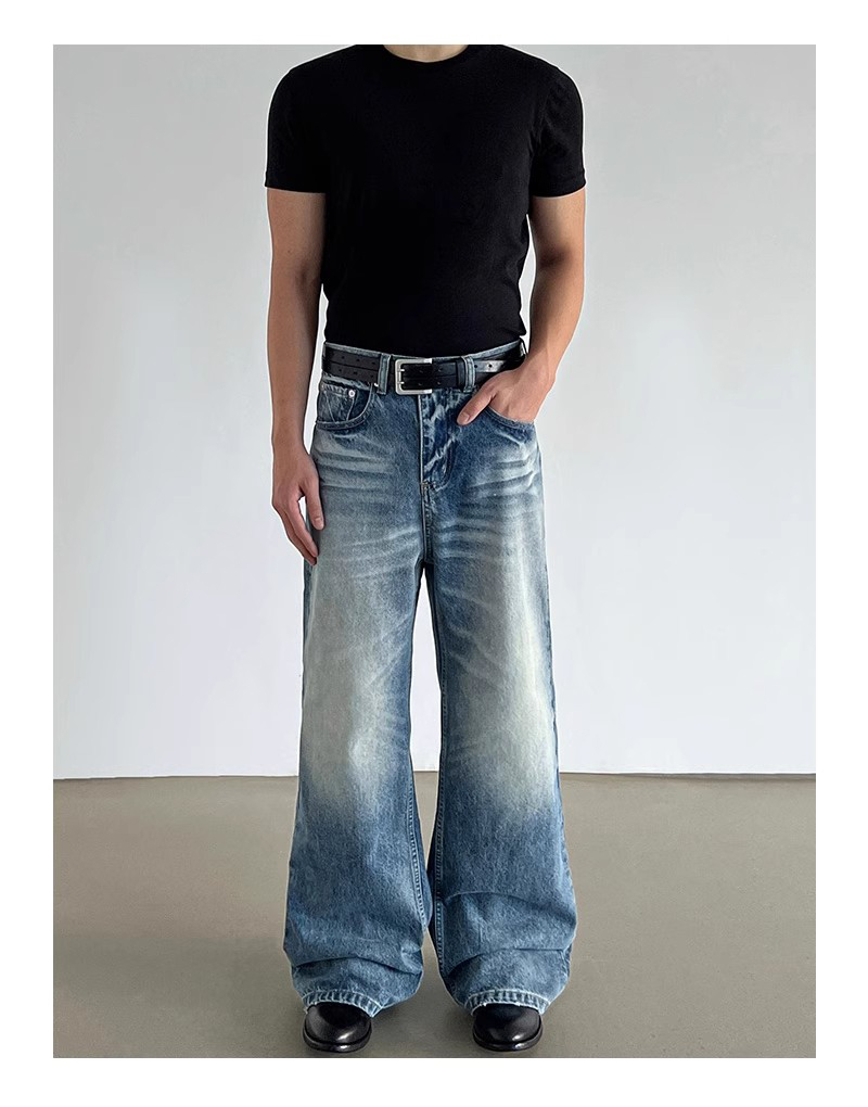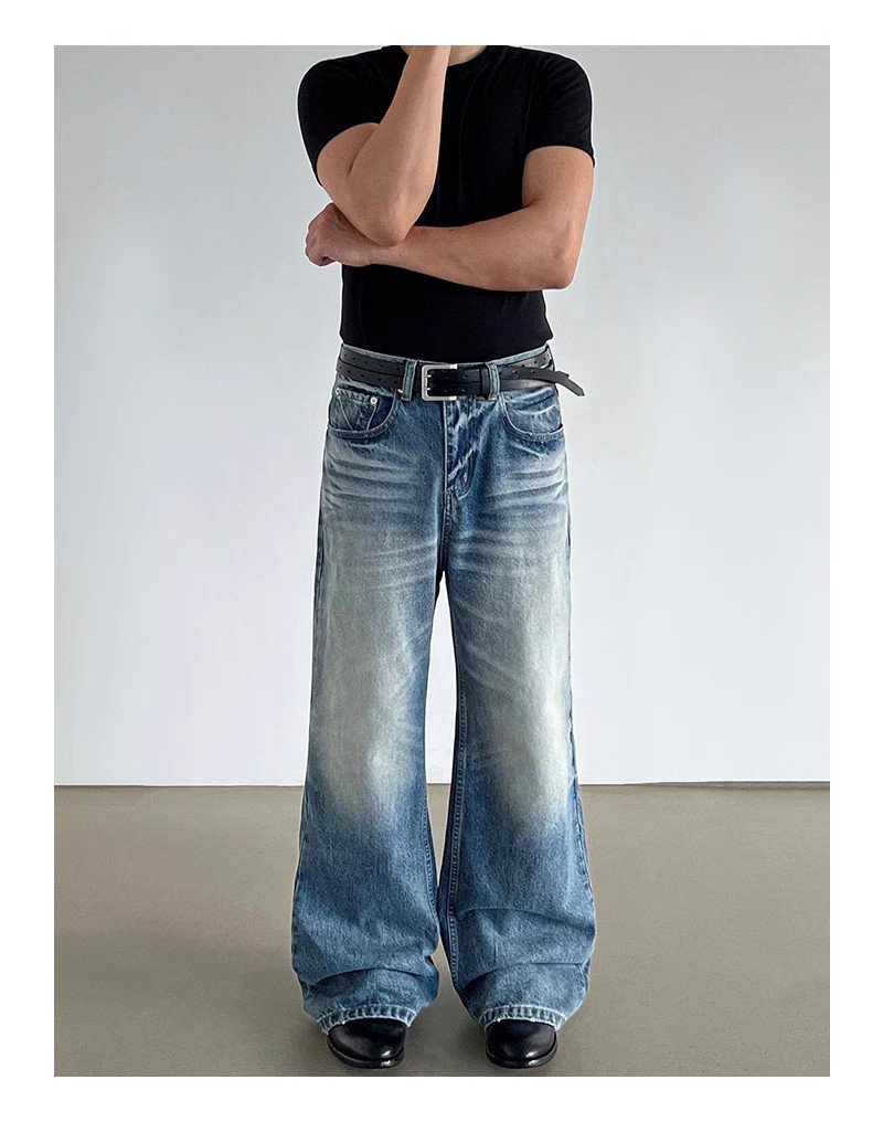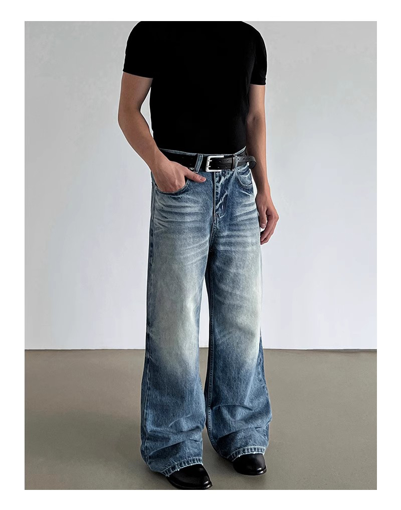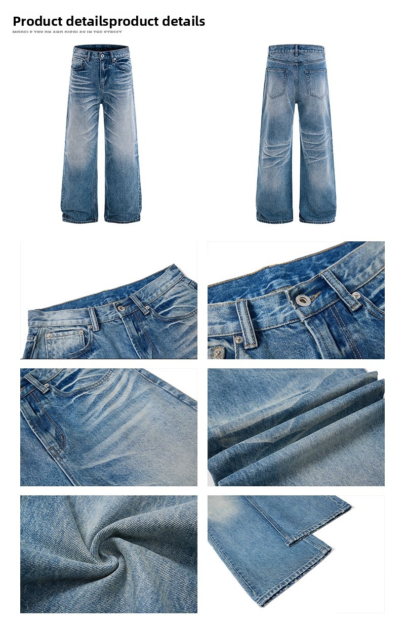 Stylish Design: American-style washed whiskered light blue jeans with a trendy youthful look.