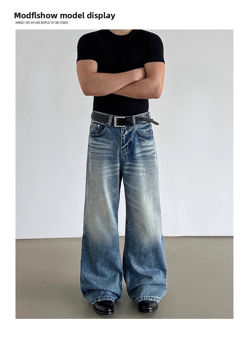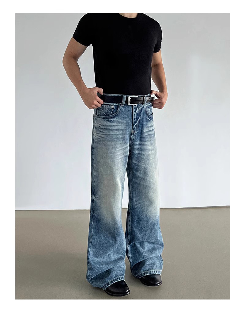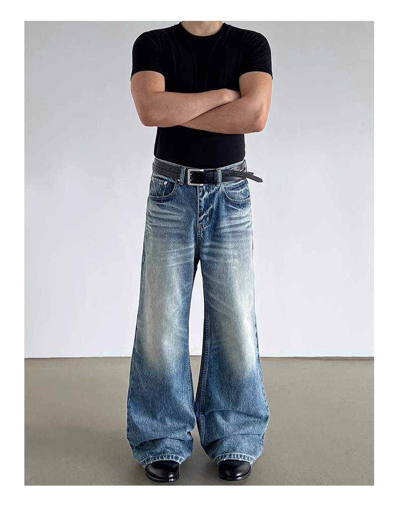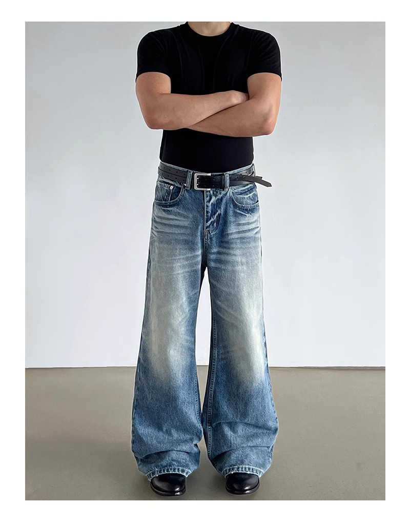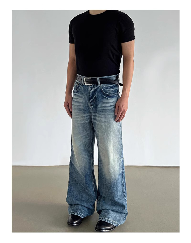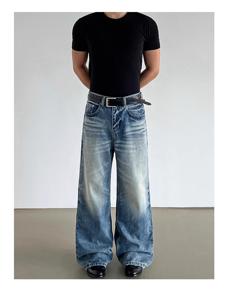 Stylish Design: American-style washed whiskered light blue jeans with a trendy youthful look.