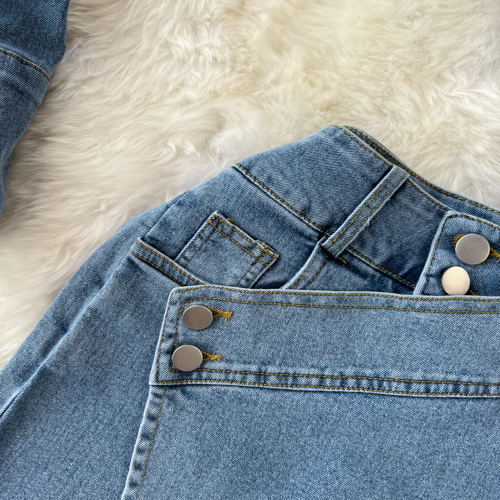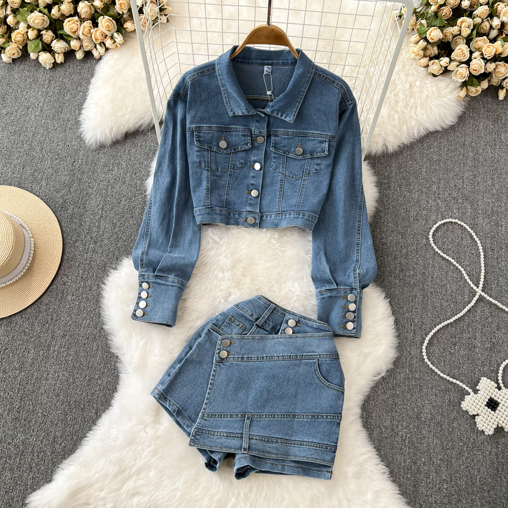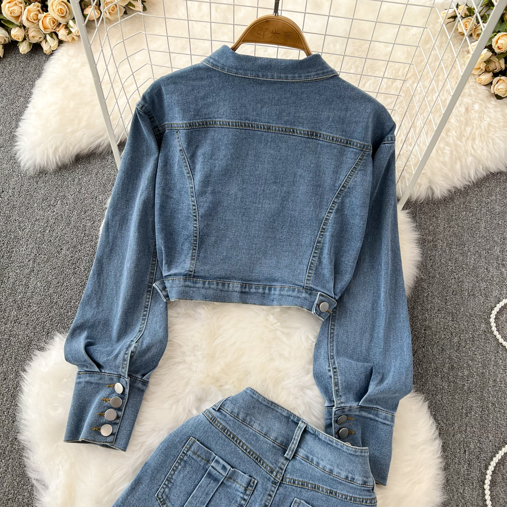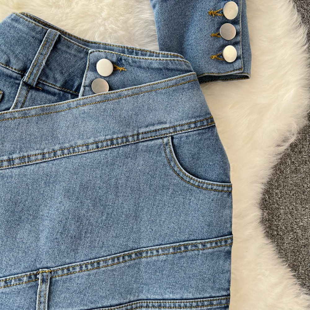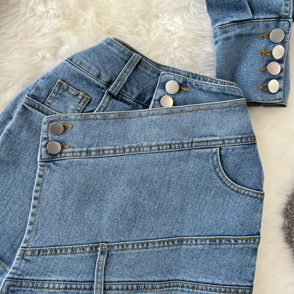Fashionable Set: Trendy women's two-piece set featuring a denim jacket and high-waisted skirt/pants.