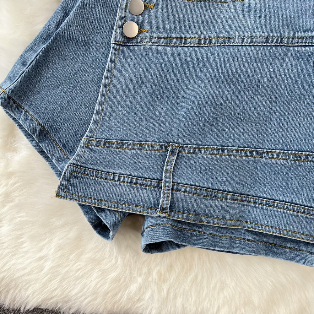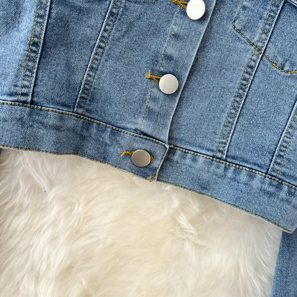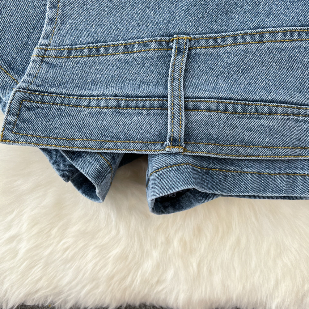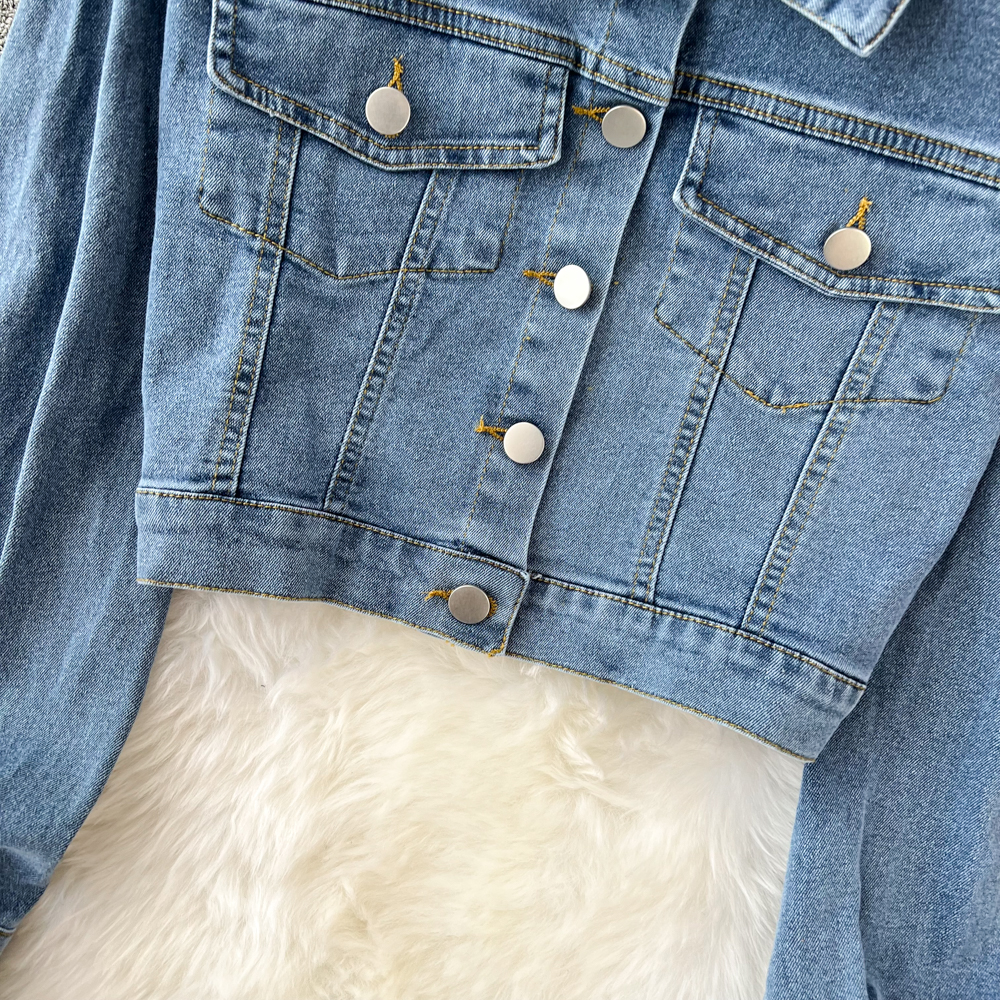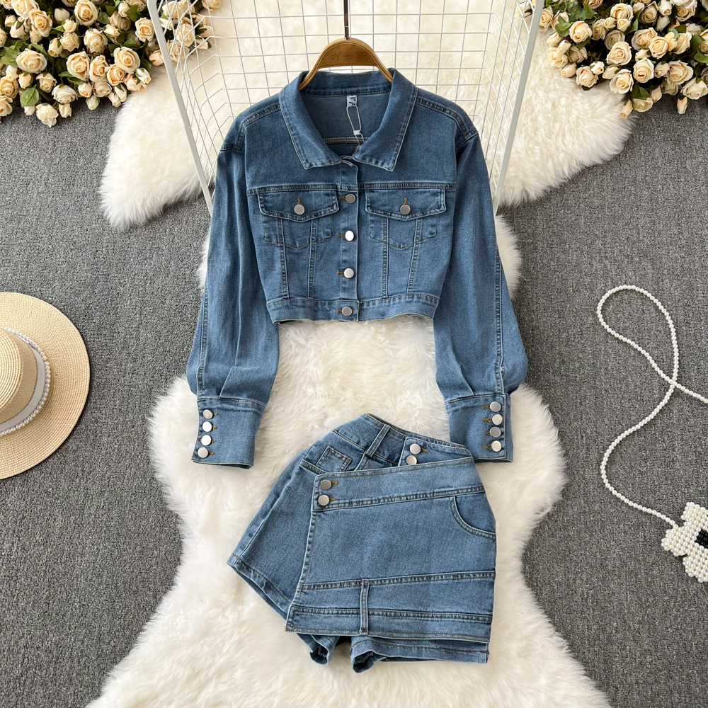 Fashionable Set: Trendy women's two-piece set featuring a denim jacket and high-waisted skirt/pants.